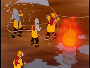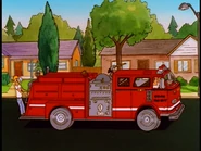 As this goes on, the alarm goes off, dispatching the men to the Goobersmooches restaurant. The four excitedly gear up and roll out for their first fire; however, no sooner do they arrive than they find that they are not needed as the small dumpster fire has been put out by Dorland. While still at the restaurant, another call goes out, this time, for all units. Hank reads the call and discovers, to his horror, that the call is for the firehouse as it has burned to the ground; this being the reason why the four are being interrogated.