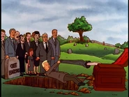 At Chet's funeral, the four serve as the pallbearers, but the four continue to argue over the prior night's events. Even worse, Dale refuses to touch the casket, believing it to be bad luck, and due to the subsequent lack of balance, they all end up tripping over each other and falling into the open grave, and Elderson's corpse loses its pants as a result. At the station, Dale tries to apologize to Hank, but he holds Dale responsible for ruining the funeral and refuses to speak to him. This does not stop the two from fighting over Chet's Alamo Beer sign, which Dale wants to plug in in his honor but Hank refuses to, citing its electrical problems.