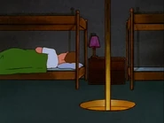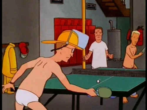 As time passes, the men's behavior at the firehouse becomes more juvenile. Things begin to come to a head the same night of the hydrant incident when a frustrated Hank struggles to relax while Dale, Bill, and Boomhauer fool around downstairs. It begins when Dale and Bill refuse to stop playing ping pong so Hank can sleep, so he destroys the ball with his foot. Bill retaliates by taking Hank's glasses and breaking them with his foot, enraging Hank. In the ensuing fracas, Dale throws a hot Frito pie at Hank for destroying the ping pong ball but hits Bill instead, causing burns on his face. Bill attempts to throw the pie back at Dale, but Dale uses his fire helmet's face mask to protect himself. Bill then runs from Hank and ends up getting stuck rear-end first in the fire pole hole trying to escape him. Finally, after Hank comes downstairs again because Dale and Boomhauer refuse to stop horsing around with the destroyed ping pong ball, Dorland informs the men of Chet Elderson's death due to natural causes.