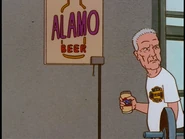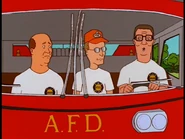 Later on, back at the station, Hank reasons with the guys that this is a once-in-a-lifetime chance and should not mess it up further. He tries to convince them to do drills but Dale, upset at Hank for pushing him aside during the hydrant incident, refuses. Chet asks Dale to plug in the Alamo sign, but Hank prevents Dale from doing so and the two start to fight over it. At the same time, Bill discovers a tub of beef jerky in the kitchen and decides to use its lid as a Frisbee, but hits Boomhauer in the side of the head, resulting in his ear injury. Boomhauer reacts by throwing the lid back at Bill, which ends up breaking a window, just as Dorland walks in and demands an explanation. Hank starts ordering the others, but Dale interrupts. The two start bickering once more before Dorland breaks them up, threatening the four that if they do not start behaving, he will have them replaced.