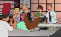 After arriving at Tokyaki's, Cotton doesn't want anything to do with the restaurant since it is Japanese where he finds the family and seats himself while Bobby wanders off to a table with children seated and greets them. Cotton right away gets on edge at thinking the Mexican cook is the Japanese Emperor Hideki Tojo and becomes even more rattled as the performance cooking continues until he starts to get into an altercation and attempts to attack the cook at their table. During the fight, Hank tries to keep Cotton under control. Still, things turn dire when the cook accidentally flicks the piece of shrimp into Cotton's mouth and swallows it, causing him to stifle that he slips and falls onto the tabletop hibachi grill, burning him as well. The cook triggers the fire sprinklers at the tabletop grill on Cotton while everyone watches in horror. Hank pulls and lays down the severely injured Cotton who sufferingly concedes defeat to the cook while everyone watches with sadness and concern whilst Lucky casually comments about Cotton's predicament. While at Bobby's table, he eats the piece of shrimp after the cook flicks it at him and enjoys himself with the children.