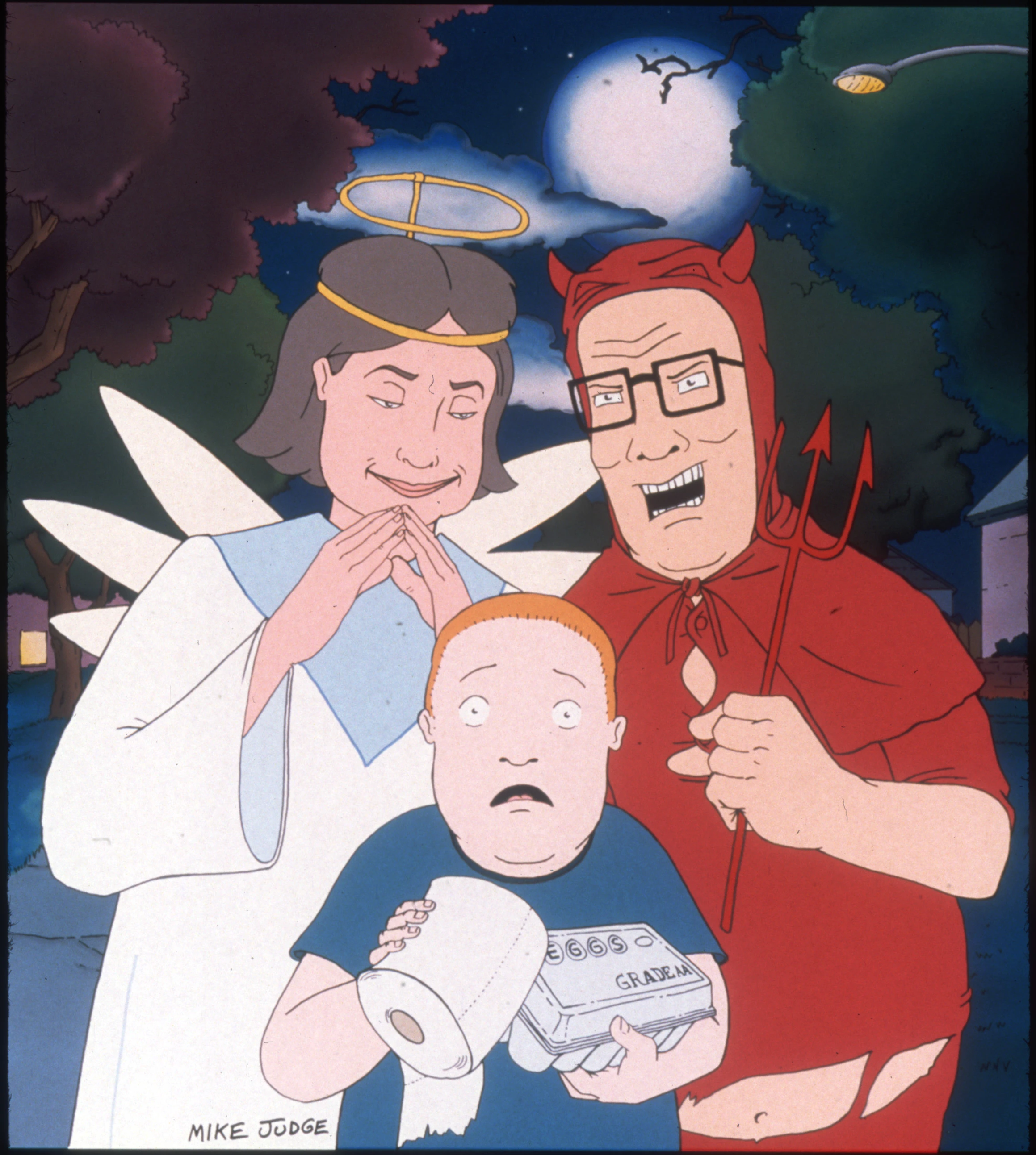 Peggy suggests that the haunted house be held inside the family garage. Later, Hank initiates Bobby in the fine art of trick or treating by covering Junie's house with toilet paper. As a furious Junie exits the dwelling, Hank and his son run for cover. But Junie gets a good look at Bobby's face and reports him to the police. Hank takes the blame for the incident, but out of Peggy's earshot, he praises the boy as a "regular Halloween hellraiser." Later, Luanne tells Bobby that his father is a Satanist. At first, Bobby dismisses the notion, but after recollecting several of Hank's comments about Halloween (and an unpleasant liver dinner), the boy comes to believe Luanne may be right. Meanwhile, Junie convinces the City Council that her house was attacked by Satanists using her dead cat (that she accidentally ran over herself) as proof. As a result, the Council passes a curfew that, in effect, cancels Halloween. Despite this, Hank vows to teach his son "the true meaning of Halloween come hell or high water."