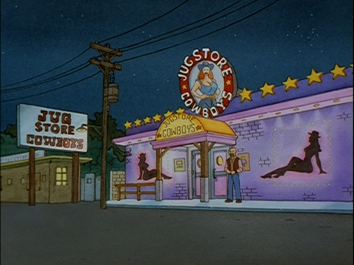 Jugstore Cowboys is a strip club in Arlen, Texas, that is owned and managed by Keith. The strip club is frequented by Buck Strickland and Mr. Holloway. Jugstore Cowboys debuted in the Season 2 episode "The Company Man" and was prominently featured in the Season 10 episode "24 Hour Propane People".