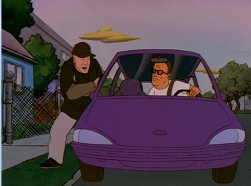 After the trial, Hank goes to retrieve his truck from the impound, only to discover that it has been disassembled due to the police checking if Billy Ray Walters hid any drugs in the compartments. Back at the Hill house, while Hank is looking for something, Luanne comes and tells Hank she retrieved the schematic to his truck and had already lined up the parts. Hank states because of the stress, he needs to fish now, which forces him to use a small rental car from Mega Lo Mart.