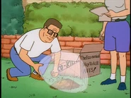 The next day, Hank is heartbroken. He has no shred of grass left on his dirt lawn now. Dale has completely ruined his beautiful trophy lawn. Peggy goes on over to Nancy's house to talk about the Cinco de Mayo block party. Nancy offers her some sugar, but they are out, so Peggy volunteers to go down to the basement and grab a bag. On her way down, she notices a strange display of fire ants, and wanders over for a look. She sees that Dale has a map drawn out, with all of the dates and times of release for the ants. Next to the map, is a huge tank of the remaining Fire Ants. She confronts Dale, then heads home to tell Hank.