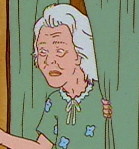 Ma is an elderly Caucasian woman with a skinny build, pale skin, and short white hair. She wears a green dress with a blue floral pattern.