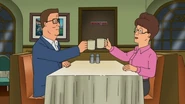 Surprised, they immediately leave the restaurant and pick up Bobby, who sulks the entire time on the way home and ignores listening to Hank and Peggy's apologies. The next morning, Hank and Peggy believe that he will forgive them, but he continues to be angrily silent. Peggy cooks him an elaborate breakfast, surprising him. She discreetly claims that Hank was the one who wanted to stay at the restaurant longer. When Hank comes to the table to eat, Bobby glares at him but then smiles at his mother, making Hank realize that Peggy blamed him for their mistake. Later in the alley, Kahn and Dale recommend that Hank bribe Bobby just as Peggy did. When Bobby returns home, Hank tells him that Peggy is actually culpable for their late arrival, giving Bobby several dozen dollars to spend at the arcade to please him.