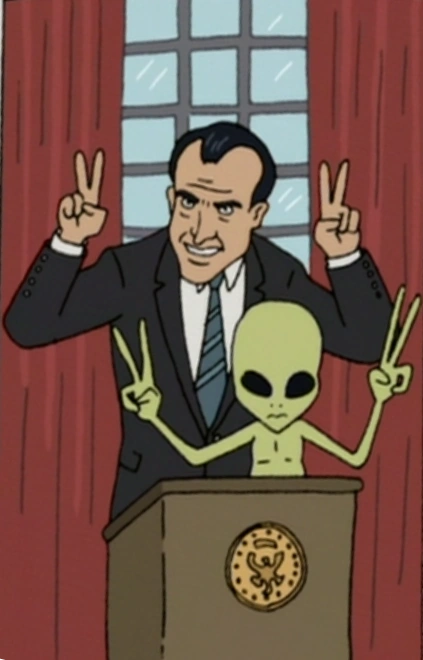 Richard Milhous Nixon (January 9, 1913 – April 22, 1994) was the 37th president of the United States, serving from 1969 until his resignation in 1974. A member of the Republican Party, he previously served as the 36th vice president under President Dwight D. Eisenhower from 1953 to 1961, and also as a representative and senator from California. His presidency saw the reduction of U.S. involvement in the Vietnam War, détente with the Soviet Union and China, the Apollo 11 Moon landing, and the establishment of the Environmental Protection Agency and Occupational Safety and Health Administration. Nixon's second term ended early when he became the only U.S. president to resign from office, as a result of the Watergate scandal. Nixon is mentioned at various times throughout the series and is pictured giving v signs with an alien in the Season 9 episode "Dale to the Chief".