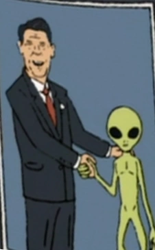 Ronald Wilson Reagan (February 6, 1911 - June 5, 2004) is the former president of the United States. He is mentioned at various times throughout the series and is pictured shaking the hands of an alien in the Season 9 episode "Dale to the Chief".