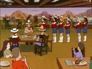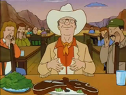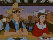 Holloway notices that Hank isn't wearing cowboy boots. Taking the plunge, Hank concocts a story about how he gave up his boots to his uncle after he was killed by a Texas-sized twister. But Holloway still yearns to see his host in a pair of boots. Hank takes Holloway and Bobby to a Western Wear Store Rhinestein's Cowboy, where he purchases a pair of tight-fitting boots and a large cowboy hat. Later, Hank asks Peggy to don a Kilgore Rangerette-type outfit for their dinner engagement with the Holloways. Though greatly displeased, Peggy honors her husband's request. Mrs. Holloway bows out of dinner at the last moment. At The Panhandler Steakhouse, Mr. Holloway orders the 72 ounce steak challange which he quit after one bite, then tells Hank that he and Thatherton are headed out to a strip club. But Hank intercedes, insisting that if anyone is taking Holloway to a "gentleman's club," it will be him.
