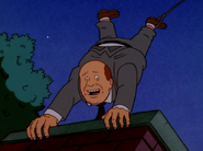 Elsewhere, at Bill's house, Dale finishes the final touches on the lawn chair ride. As he sits on the chair, Bill wonders why Dale carries a revolver, to which the latter explains that he will shoot him to relieve pain if he develops high-altitude pulmonary edema, worrying the former. To Bill's reluctance, Dale orders Boomhauer to remove the sandbags, and the tethered lawn chair begins floating. Although ecstatic at first, Bill panics when Boomhauer removes the rope, and he almost falls off the lawn chair but floats upside down just above the ground because of the balloons suspending him. He begins being involuntarily dragged by the balloons through the adjacent street and into the sky. Dale tries to shoot at the balloons but misses, allowing Bill to soar away uncontrollably. At night, after work, Bobby's arm feels strained when he tries to reach for a piece of chicken at dinner. Hank commends him for being a hard worker.