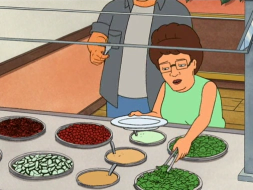In the episode The Company Man. Hank and Peggy take Mr. Holloway to a steak dinner. Trying to impress the overly-impressionable Holloway, Hank makes Peggy dress up like a cowboy, which turns out to be practically the same outfit as the restaurant staff, causing them to confuse her for a waitress. When they are in line in the salad bar, they run into Dale and Nancy. Holloway eventually orders the 72-ounce challenge, but quits after one bite, causing the entire restaurant to jeer at him and Hank. Holloway goes to a game machine, after which Hank hears that Thatherton's table is ready, sending Hank into a panic to avoid Tatherton stealing Holloway's attention.