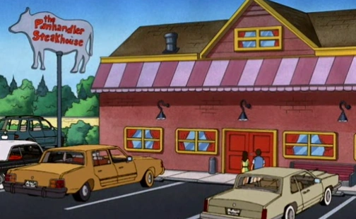 This restaurant appears in the episode And They Call It Bobby Love where Bobby goes and to eat with his parents Hank and Peggy after getting dumped by his now ex-girlfriend Marie, only to discover Marie, despite being a vegetarian, is eating there with her family. Feeling bitter, Bobby orders the 72 ounce lonestar sirloin steak challange, which Marie correctly interprets as a challenge. Despite Marie's frequent agitations, the entire restuarant begins cheering for Bobby, incluing her own parents. Bobby manages to finish the entire 72-ounce steak, causing Marie to leave in a huff.
