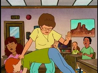 After spanking Dooley in school for pantsing her, Peggy becomes feared, especially when she gets an old spanking paddle and becomes Paddlin' Peggy Hill.